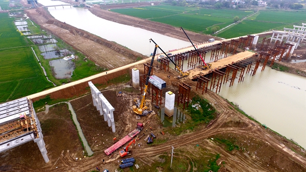 3月18日, 徽州大道項目羅埠河特大橋首件鋼箱梁吊裝成功。