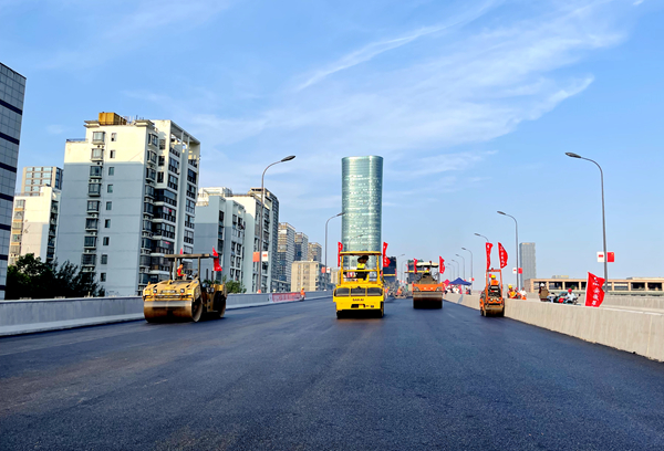 暢通二環(huán)(西南環(huán))金寨路、合作化路節(jié)點(diǎn)工程主線高架橋橋面首次瀝青攤鋪順利完成