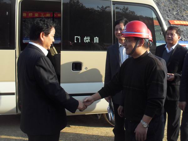 黃省長(zhǎng)首先在施工現(xiàn)場(chǎng)聽取了績(jī)黃高速項(xiàng)目辦主任方昱對(duì)于工程建設(shè)情況的匯報(bào)。聽完匯報(bào)后,黃省長(zhǎng)對(duì)公司和項(xiàng)目部的工作給予充分肯定和高度評(píng)價(jià)。他說,“省路橋公司是本省施工的龍頭企業(yè),代表本省的形象,希望你們?cè)俳釉賲枺^續(xù)做好規(guī)范化施工,高效管理,抓住當(dāng)前機(jī)遇,努力打造優(yōu)質(zhì)工程,不斷提升企業(yè)形象,開辟新的市場(chǎng),繼續(xù)做大做強(qiáng)?!蓖艨偙響B(tài),“省路橋公司在黃省長(zhǎng)的關(guān)懷下,近年來企業(yè)改制改革方面取得了一定成效,企業(yè)取得了巨大發(fā)展,我們將繼續(xù)做好施工規(guī)范化、精細(xì)化管理,在省領(lǐng)導(dǎo)的關(guān)心與支持下,我們一定會(huì)抓住機(jī)遇、迎接挑戰(zhàn),把企業(yè)做大做強(qiáng)”。