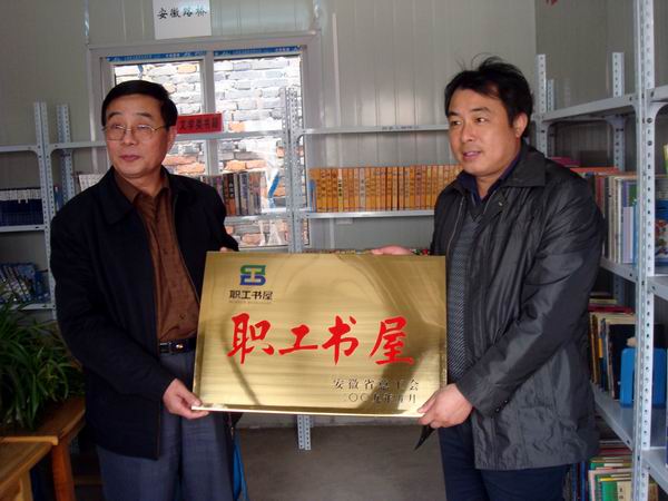 劉主席首先來到項目部職工書屋,察看了書屋的軟硬件設施及借閱情況,并聽取了項目經理江仲明關于項目施工及職工書屋創(chuàng)建情況的匯報。劉主席對書屋的建設和管理予以了肯定和贊許,并對書屋更好的發(fā)展提出了希望和要求:一、立足實際、講求實效;二、營造氛圍,大力宣傳;三、實現資源共享,發(fā)揮最大效益;四、總結經驗、持續(xù)發(fā)展。邢應梅書記還饒有興趣地翻看了圖書借閱登記表,了解職工借閱圖書情況,并對進一步完善職工書屋的建設提出了幾點建議。隨后舉行了簡短的授牌儀式,劉主席向項目經理江仲明轉授了由安徽省總工會頒發(fā)的“職工書屋”牌匾,并代表集團工會向職工書屋贈送了各類書籍300余冊。
