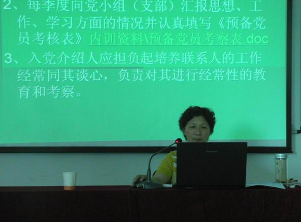 黨委辦公室主任劉昀主持了培訓會,并就發(fā)展黨員工作程序,作了專題講座。劉主任通過PPT課件,系統(tǒng)的介紹了黨員發(fā)展程序,從制訂發(fā)展黨員的工作計劃開始,到預備黨員轉正、整個入黨材料存入個人檔案,以及最后的責任追究都作了詳細介紹,讓與會人員對發(fā)展黨員工作的程序有了清楚的了解。隨后,大家一起觀看了《欲之害——段義和腐敗案件警示錄》。專題片揭露了段義和利用職務便利大肆索賄的腐敗行徑,深刻揭示了腐化墮落的思想根源和蛻變軌跡。通過觀看警示教育片,使大家接受了一次深刻的思想教育和精神洗禮,進一步認識了在新形式下反腐倡廉建設的重要性。