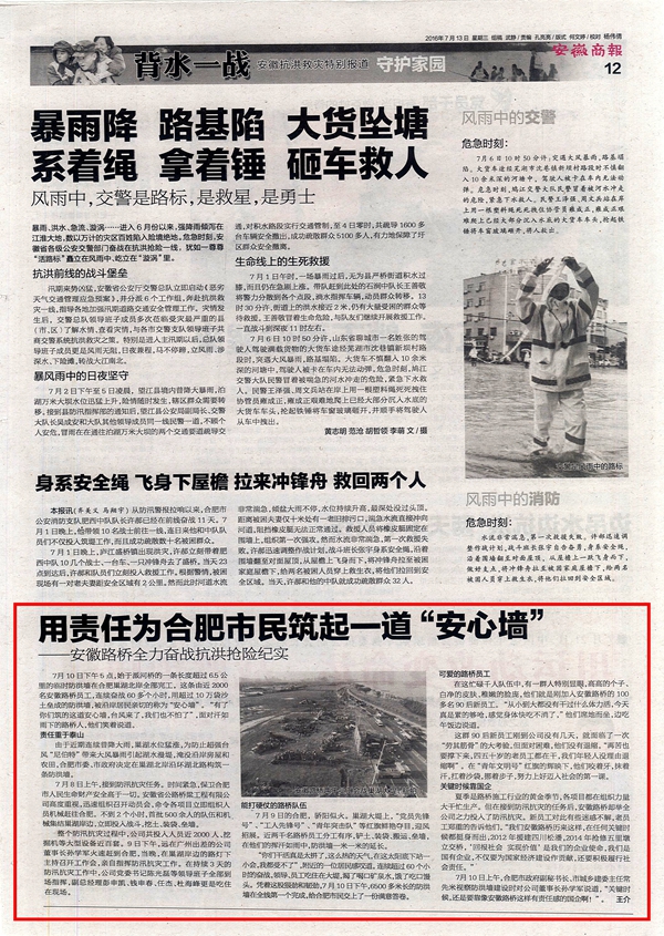 省級媒體聚焦公司抗洪搶險工作 發(fā)布時間:2016年07月13日 來源:黨委辦公室 發(fā)布人: 作者:王東 瀏覽:4676次 近日,公司積極響應合肥市委、市政府號召,全力參與環(huán)湖大道和十五里河抗洪搶險的事跡得到社會的高度關注。7月12日、13日,中安在線、《安徽商報》等多家省級媒體對公司抗洪搶險事跡進行了連續(xù)報道。