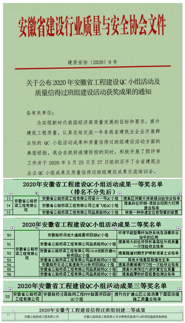 6月4日,安徽省建筑質(zhì)量與安全協(xié)會公布了2020年安徽省工程建設QC小組活動及質(zhì)量信得過班組建設活動獲獎成果名單。公司QC小組申報的《提高區(qū)間管片拼裝錯臺驗收合格率》等3項成果榮獲一等獎,《環(huán)保節(jié)能型骨料加熱系統(tǒng)在瀝青拌合站中的應用》等7項成果榮獲二等獎,《提升改擴建山區(qū)公路瀝青下面層縱縫施工質(zhì)量合格率》榮獲三等獎。同時,甘肅銀百高速TY14標項目箱梁預制班組榮獲安徽省工程建設信得過班組創(chuàng)建二等成果。