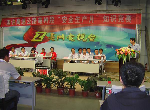 6月12日下午,在亳州市電視臺七樓演播廳舉辦了泗許高速亳州段“安全生產月”知識競賽,此次競賽由泗許高速亳州段建設辦舉辦,監(jiān)理單位和各施工單位共六支隊伍參加了比賽。亳州市質量安全監(jiān)督局副局長程權,泗許高速亳州段建設辦工程部部長蔡兵出席競賽并擔任競賽評委。