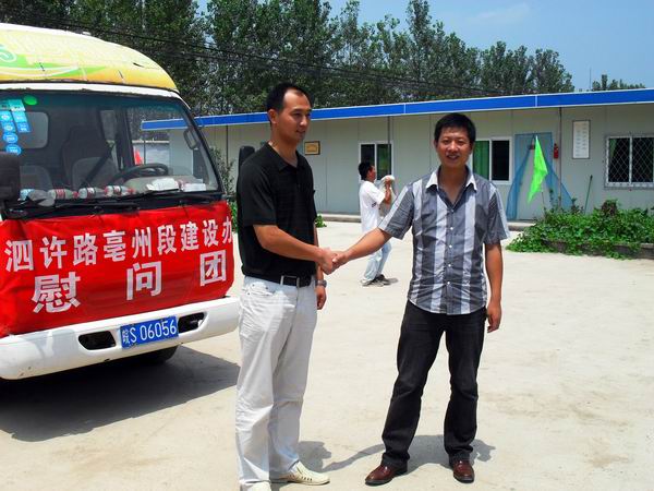 安徽交投集團泗許高速亳州段建設(shè)辦到泗許01標慰問 發(fā)布時間:2009年07月29日 來源:泗許01標 發(fā)布人: 作者:章玉潔 瀏覽:5434次 連日來,持續(xù)高溫,7月24日上午,交投集團泗許高速亳州段建設(shè)辦綜合部部長王文飛一行帶著綠豆等防暑慰問品,冒著烈日來到泗許項目01標進行慰問,讓我標段的所有員工在高溫一線倍感清涼。