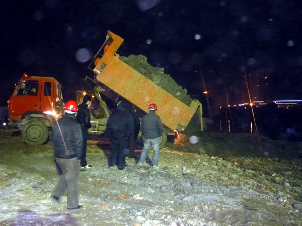 當12月19日,宋斗灣路完成第一根樁(位于南淝河北側,屬于3#橋臺)的開挖澆注工作后,項目經理部就開始籌劃南淝河南側的筑島圍堰工作。12月24日,當3#橋臺的六根樁全部澆注完成后,當天晚上仍繼續(xù)前一晚的筑島工作。每次筑島時,現(xiàn)場橋梁技術員、測量技術員和安全員都和工人們一起奮戰(zhàn),而每次奮戰(zhàn)都是一個通宵。截至25日,南淝河筑島圍堰共計用土近270車,約4600方,筑島面積和筑島深度達到預案和監(jiān)理要求,符合現(xiàn)場施工的實際要求。至此,筑島圍堰工作圓滿完成。