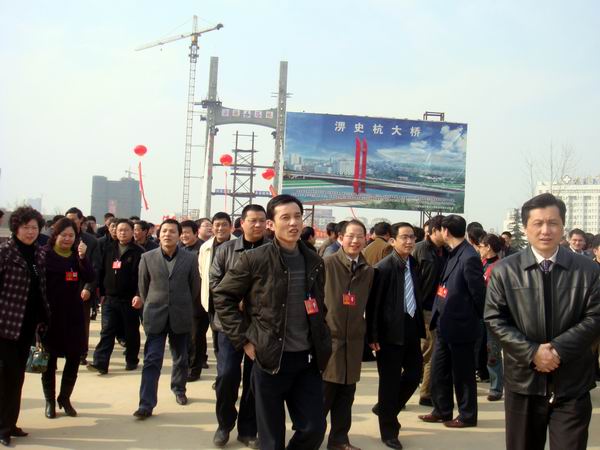 在大橋南端,代表委員們聽(tīng)取了業(yè)主負(fù)責(zé)人六安市建委副主任曹德林關(guān)于大橋的相關(guān)介紹。當(dāng)曹主任介紹到自2009年2月1日開(kāi)工以來(lái),項(xiàng)目部緊緊圍繞工程目標(biāo),編排工期、制定方案,狠抓落實(shí);全體員工凝心聚力、攻堅(jiān)克難,確保各項(xiàng)目標(biāo)任務(wù)順利完成,預(yù)計(jì)4月初主跨即可合攏時(shí),代表委員們不由地驚嘆起來(lái)。