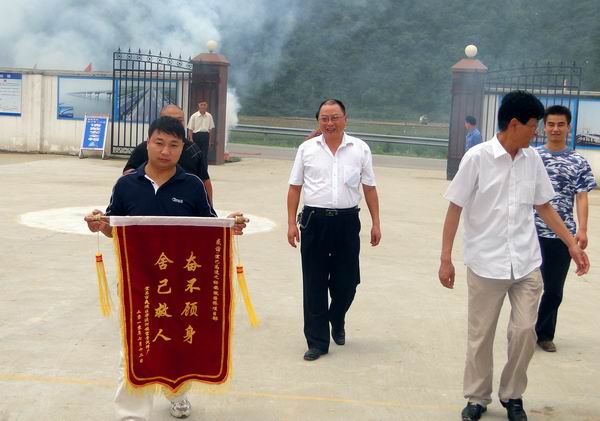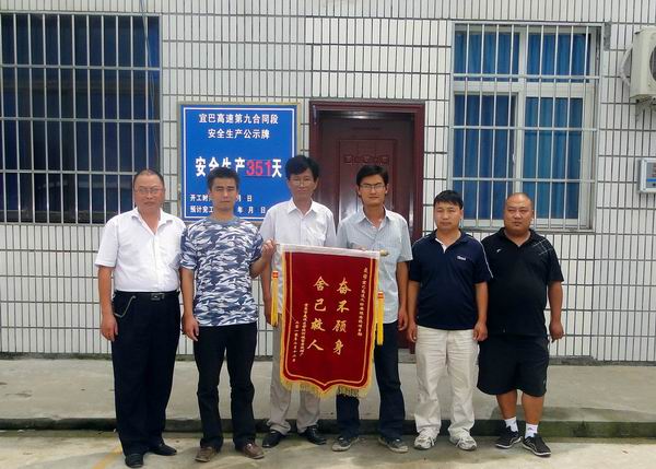 為感謝救人宜昌汽修廠送錦旗到宜巴09標 發(fā)布時間:2010年07月20日 來源:宜巴09標 發(fā)布人: 作者:晏永超 瀏覽:4632次 7月15日,公司宜巴09標項目部禮炮聲隆隆,喜氣洋洋。宜昌市夷陵區(qū)霧渡河鎮(zhèn)富貴汽修廠為感謝公司員工奮不顧身搶救落水人員特送來錦旗,錦旗上寫著“奮不顧身,舍己救人”。 6月26日,福貴汽修廠員工駕車經(jīng)過我項目二工區(qū)馬家河二號橋附近時,突然沖入河中,我部員工王雪松、韋祥峰等見此情景,奮不顧身跳河救人,同時項目部積極調(diào)配車輛設備,奮力施救,經(jīng)過一個小時的救援,駕駛員獲救。夷陵區(qū)電視臺對此進行報道,引起了強烈的社會反響。 王雪松、韋祥峰等人在接受夷陵區(qū)光電中心記者采訪時謙虛的說,面對危險,任何人都會主動施救,我們只是做了安徽路橋人應該做的事情。一個人就是一面旗子,王雪松、韋祥峰等就是安徽路橋的一面旗子,飄揚在宜巴高速路上。