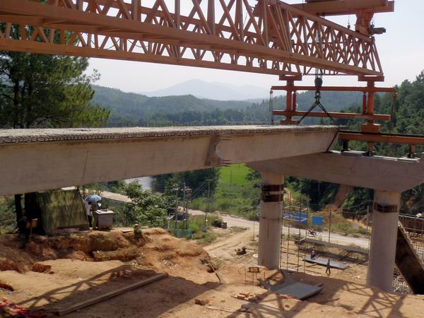 為了確保架梁工作的順利開展,項目部領(lǐng)導(dǎo)到現(xiàn)場指導(dǎo)架橋機的拼裝、檢驗等工作,通過對架梁人員進行分部分項技術(shù)交底,讓所有現(xiàn)場作業(yè)人員都能做到熟捻于心。經(jīng)過施工人員精心施工,努力奮斗,于10月2日完成架橋機拼裝,10月3日完成調(diào)試。10月5日,在項目部領(lǐng)導(dǎo)、監(jiān)理和駐地辦領(lǐng)導(dǎo)的共同指揮下,我標(biāo)段首片箱梁成功架設(shè)?,F(xiàn)場鞭炮齊鳴,掌聲如雷,為國慶增添新的喜慶。