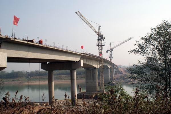 青弋江大橋全長454米,凈寬11米,結(jié)構(gòu)形式為30×10+70+42×2的簡支箱梁與現(xiàn)澆懸臂橋。該工程于2007年開工,前期由于施工條件的限制和其它不利因素,工程進(jìn)展頗不順利。后來在公司領(lǐng)導(dǎo)的大力支持下,全體施工人員上下合力,積極創(chuàng)造條件進(jìn)行施工,全橋終于順利合龍。盛總在合龍現(xiàn)場指出,雖然大橋已順利合龍貫通,但后期任務(wù)還相當(dāng)艱巨,橋面、護(hù)欄、橋頭搭板和護(hù)坡等都需要抓緊施工,在保證質(zhì)量、保證安全的情況下,組織力量加快施工進(jìn)度,確保實(shí)現(xiàn)元月通車的目標(biāo)。