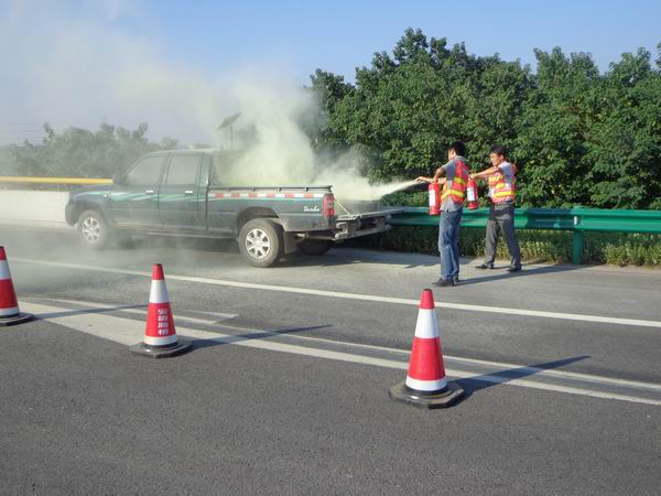 16:40,隨著蕪宣高速公路管理公司副總經(jīng)理郭建華的一聲令下,蕪宣養(yǎng)護(hù)項目組織開展的突發(fā)交通事故處置聯(lián)合演練開始。16時45分,事故車輛撞向錐標(biāo),沖入封閉區(qū)并撞壞護(hù)欄。16:46,巡標(biāo)員發(fā)現(xiàn)事故,立刻補(bǔ)齊被撞倒錐標(biāo),并向項目安全環(huán)保部負(fù)責(zé)人報告;同時安排其他巡標(biāo)員到事故車輛后方搖旗警示。16:48,項目安全環(huán)保部負(fù)責(zé)人李剛就事故情況報告監(jiān)控中心,并向項目應(yīng)急救援小組組長曹祝林匯報事故情況。16:54,蕪湖市高速交警一大隊巡警及施救組趕到事故現(xiàn)場,組織對駕駛員進(jìn)行營救。16:55,施救組成員對受傷駕駛員傷口進(jìn)行消毒、包扎。16:57,事故車輛起火。16:58,項目應(yīng)急救援小組成員對事故車輛進(jìn)行滅火。17:02,路政部門到達(dá)現(xiàn)場,對事故車輛進(jìn)行勘察,并向陪乘人員了解事故情況及駕駛員情況。17:11,對蕪宣方向車輛進(jìn)行管制。17:34,清障車在未知情情況下進(jìn)入事故現(xiàn)場,對事故車輛進(jìn)行施救。17:39,蕪宣方向交通開放,在交警、路政、項目巡標(biāo)員的指揮下緩慢行走。17:41,清掃組對事故現(xiàn)場的拋灑物、撞壞的錐標(biāo)等進(jìn)行清掃。17:45,交通恢復(fù)正常,郭建華總指揮宣布演練結(jié)束。