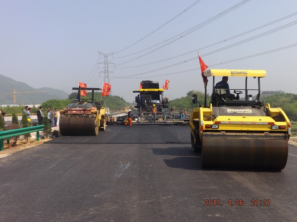 為保證此次試驗段攤鋪順利進行,項目部于4月25日晚召開專項會議,對各施工班組及機械操作人員進行詳細的技術、安全交底,對整個施工過程的各個環(huán)節(jié)進行了詳細確認,將責任、要求細化到個人。會議強調在施工過程中要嚴把質量關,瀝青出場溫度、到場溫度、攤鋪溫度、初壓溫度、復壓溫度、終壓溫度等相關指數均要在設計范圍內,同時,安全保障措施等也要控制到位。