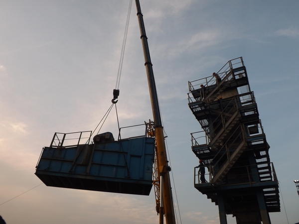 G205改建路面項(xiàng)目完成拌和站主樓吊裝 發(fā)布時(shí)間:2013年07月19日 來(lái)源:G205改建路面項(xiàng)目 發(fā)布人: 作者:楊艷峰 瀏覽:2815次 7月17日下午3時(shí),伴隨著響聲震天的鞭炮聲,兩輛大型吊車在安全技術(shù)人員和作業(yè)人員的通力協(xié)作下,安全有序地進(jìn)行拌和站主樓的吊裝。經(jīng)過(guò)全體施工人員的努力,于當(dāng)日下午6時(shí)30分完成拌和站主樓的吊裝。